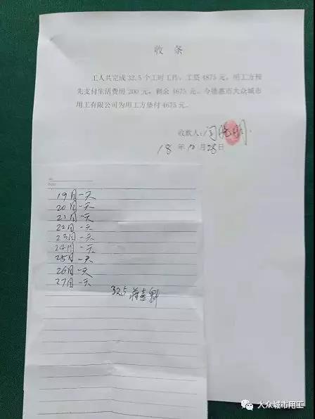 核对工时,工人收到垫付工资并签字